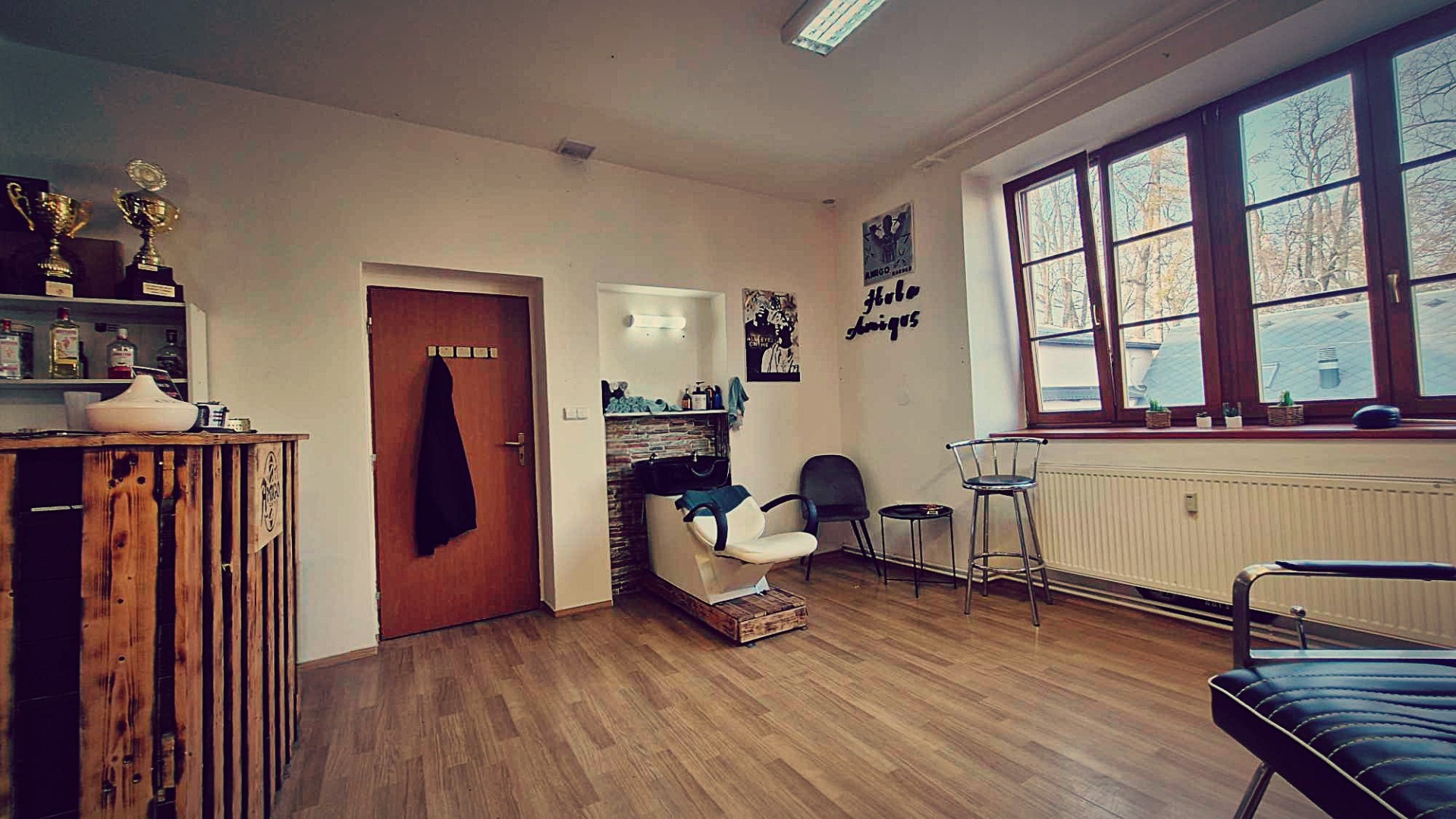 Sklenka alkoholu, černá čistící maska nebo barvení vousu , střih vlasů, stínování (fade), mytí, foukání, styling, úprava vousů, holení břitvou, zaholení kontur, úprava kníru, depilace voskem